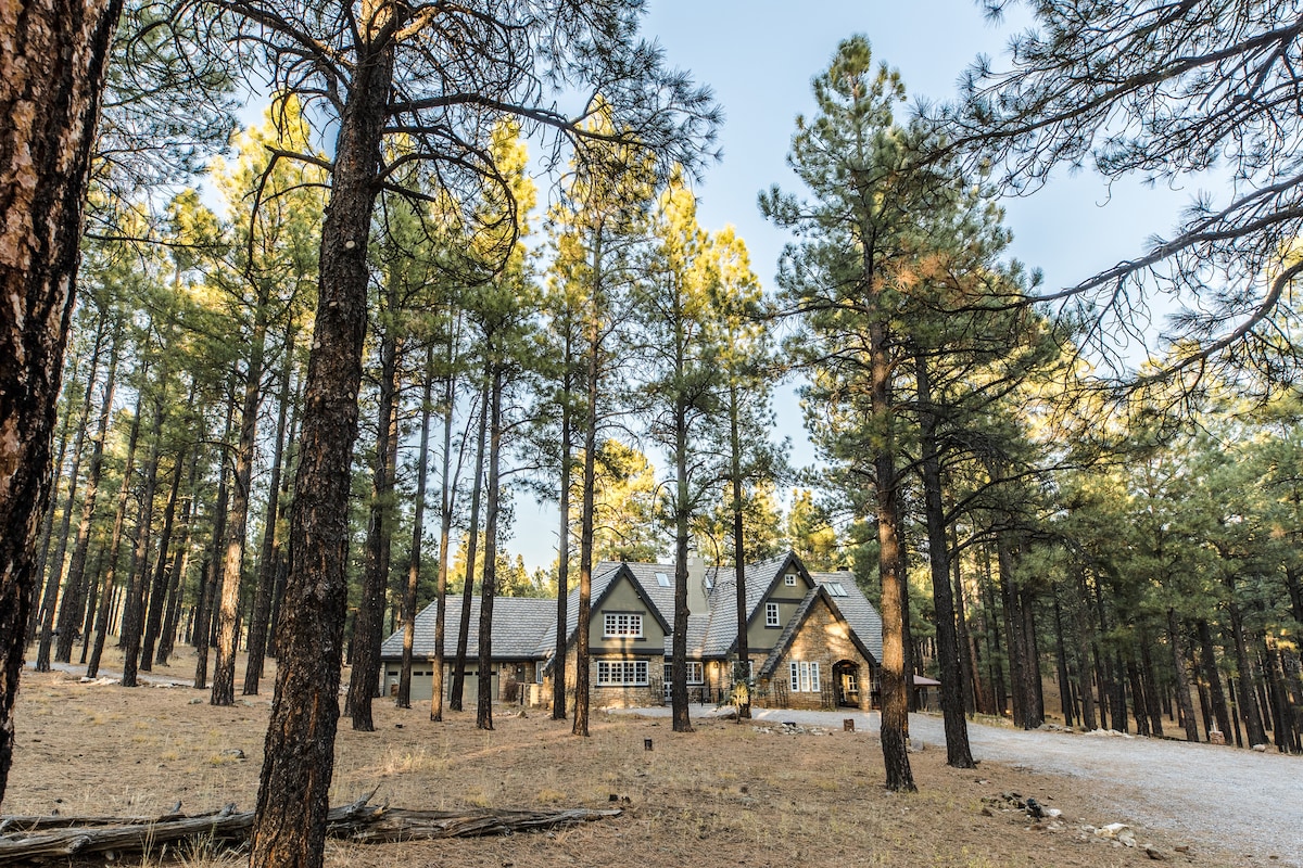 Ubicada en un tranquilo callejón sin salida, nuestra encantadora casa de campo en el bosque se encuentra en 5 acres de hermosos pinos y está a solo 5 minutos del centro de la ciudad. Nuestra propiedad limita con el sistema de senderos urbanos, por lo que puedes salir a caminar o esquiar y la cabaña cuenta con una sauna privada de cedro, una cocina totalmente equipada, una cama tamaño king Tempur-Pedic y un patio privado al aire libre. Este es el refugio perfecto en el bosque de pinos, a la vez que ofrece fácil acceso a Flagstaff, Sedona y el Gran Cañón. ¡Vive Flagstaff en todo su esplendor!