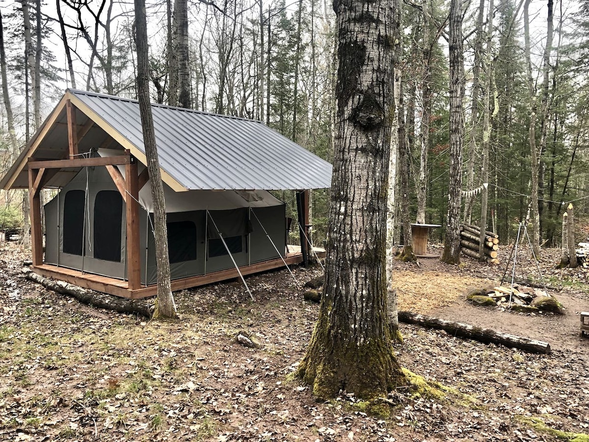 NATURALEZA ELEVADA. UNA ESTANCIA PERFECTA. TODOS LOS SERVICIOS DEL CENTRO VACACIONAL INCLUIDOS EN LA TARIFA. UN PRECIO = TODO. NO SE SORPRENDE FEES--JUST BUENOS MOMENTOS. | Alojamiento en la tienda de campaña de lujo #14 de Baby Face Nelson en POV Lake Resort. La tienda de campaña tiene capacidad para 4 personas con un futón de tamaño completo y una cama queen. Impresionante vista a Northwood y a poca distancia a pie del fácil acceso al lago con playa de arena. Rutas de senderismo en el lugar, tablas de surf de remo, kayaks, canoas, sala de juegos, tienda general y observación de estrellas. Alquiler de barcos y paquetes románticos disponibles. No se admiten mascotas ni conexiones.