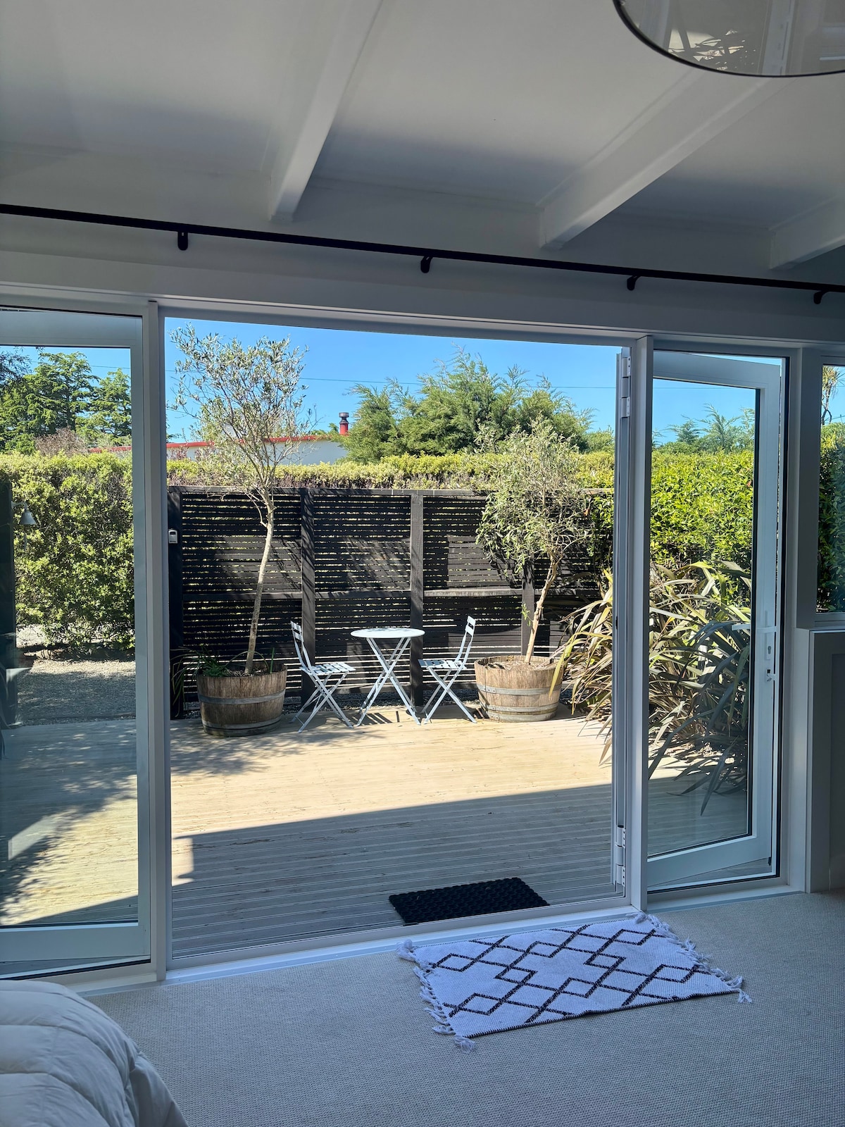 A world away from the world -Just 5 mins from Greytown. Situated on a small organic farm in a beautiful garden. Super comfy bed, stylish, mid century decor. Wake up to birdsong, star-gaze from the outside bath while listening to the call of the Ruru. Loll by the pool or borrow the bikes to go exploring. Free breakfast of good coffee, homemade muesli & fruit, artisan bread and spreads. Free-range eggs & bacon available for you to cook for $25 pp. Drive on parking, heat pump, wifi & tv.