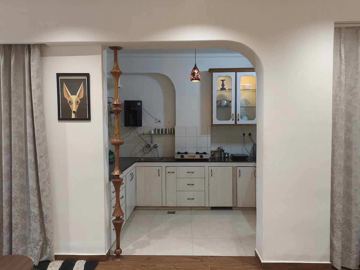 Este lugar tranquilo y sereno es artístico y elegante, con plantas, esculturas, pinturas, antigüedades e interiores de diseño creativo. Diseñado por el artista Tarpan Patel, está situado en el centro, cerca de lugares de interés, restaurantes populares, bares, arte y centros culturales. El apartamento está en la segunda planta sin acceso a ascensor. El aparcamiento está fuera del sitio, en la carretera principal. Puede estar a 1 o 2 minutos a pie. No se permiten visitas debido al COVID.