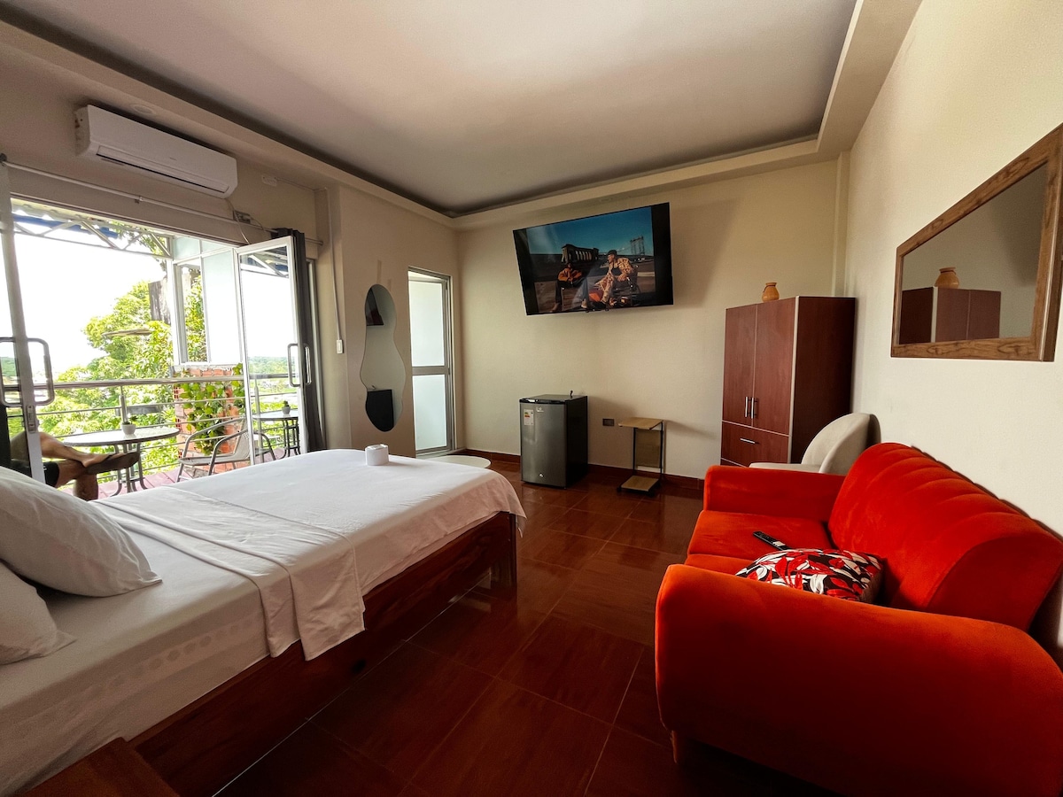 Alójate en el corazón de Yarinacocha. Esta habitación para 2 personas combina diseño contemporáneo con una ubicación estratégica para turistas y parejas. 💯 Lo mejor: Balcón privado con vista hacia Yarinacocha. 📍 Ubicación Premium: A menos de 3 minutos del Boulevard y la Laguna. • 🍳 Cortesía: ¡Desayuno incluido todos los días de tu estancia! • 🛋️ Comodidad Total: Aire acondicionado, TV Smart, frigobar y un baño de lujo con vista panorámica.