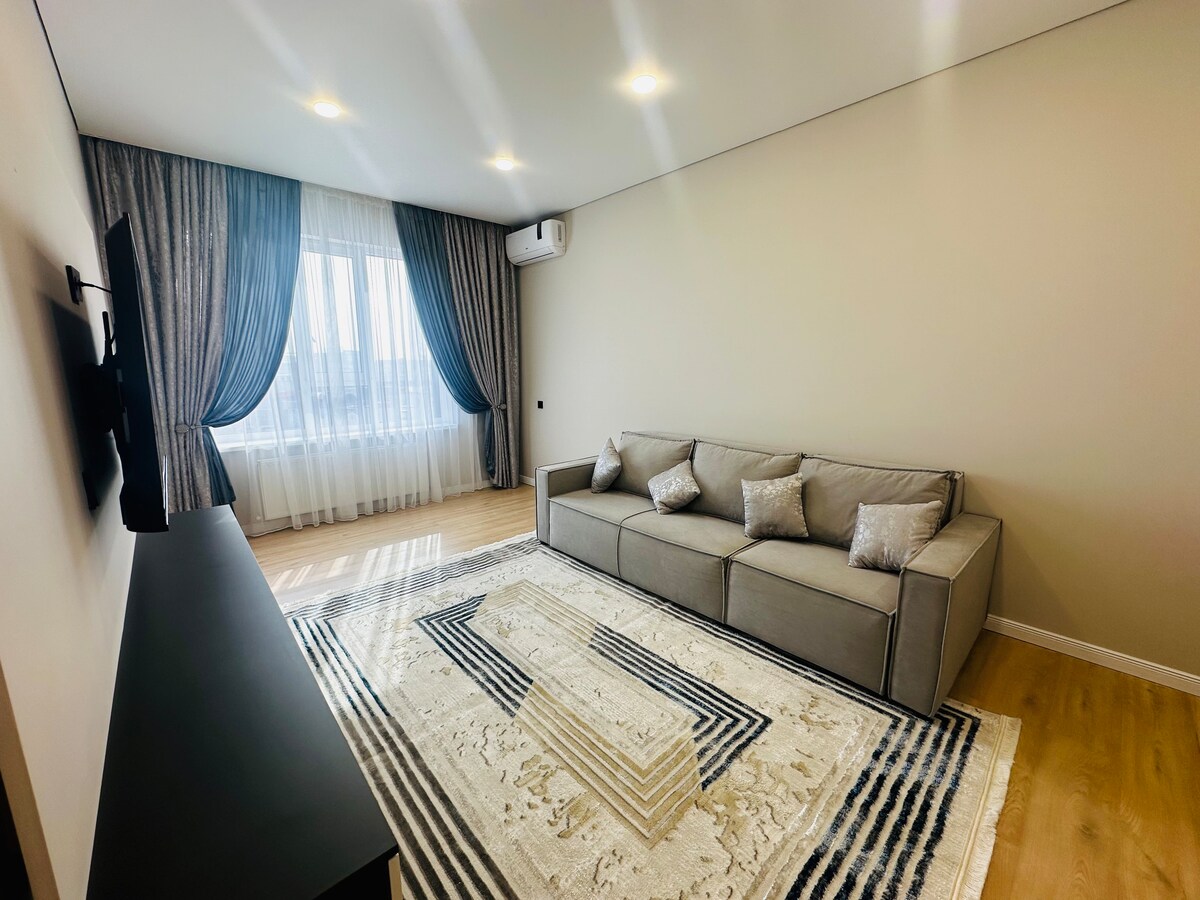 Apartamento moderno y acogedor en el centro de la ciudad en el complejo residencial seguro «Greenwich» Aeropuerto - 4 km Centro comercial Alfraganus - 1 km (10 minutos a pie) Parada de autobús - 100 m Tiendas de comestibles - 50 m Mercado - 1,5 km Complejo familiar con seguridad las 24 horas del día, los 7 días de la semana. En el patio del complejo residencial hay una gran zona verde para pasear con los niños.