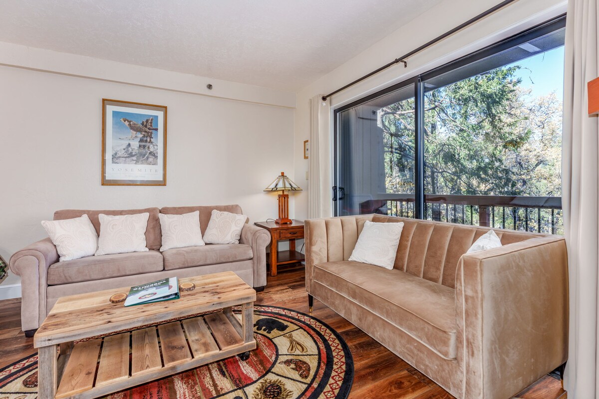 Ubicado en la serena comunidad de Yosemite West, nuestro condominio de dos niveles ofrece la base perfecta para tus aventuras en el parque nacional. Arriba, encontrarás dos cómodas camas tamaño queen, mientras que la sala de estar cuenta con un sofá cama, con capacidad para seis huéspedes. Disfruta de la comodidad de una cocina totalmente equipada y una acogedora chimenea para relajarte después de un día de senderismo. Sal al balcón privado para saborear tu café de la mañana en medio del tranquilo entorno del bosque.
