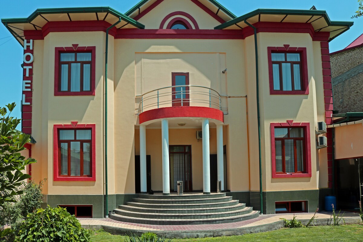 Pequeño hotel con 13 habitaciones, cada habitación tiene baño separado. Las habitaciones están limpias y son cómodas. El hotel está en una zona residencial tranquila de Tashkent. Tenemos un hermoso jardín con muchas flores y rosas.