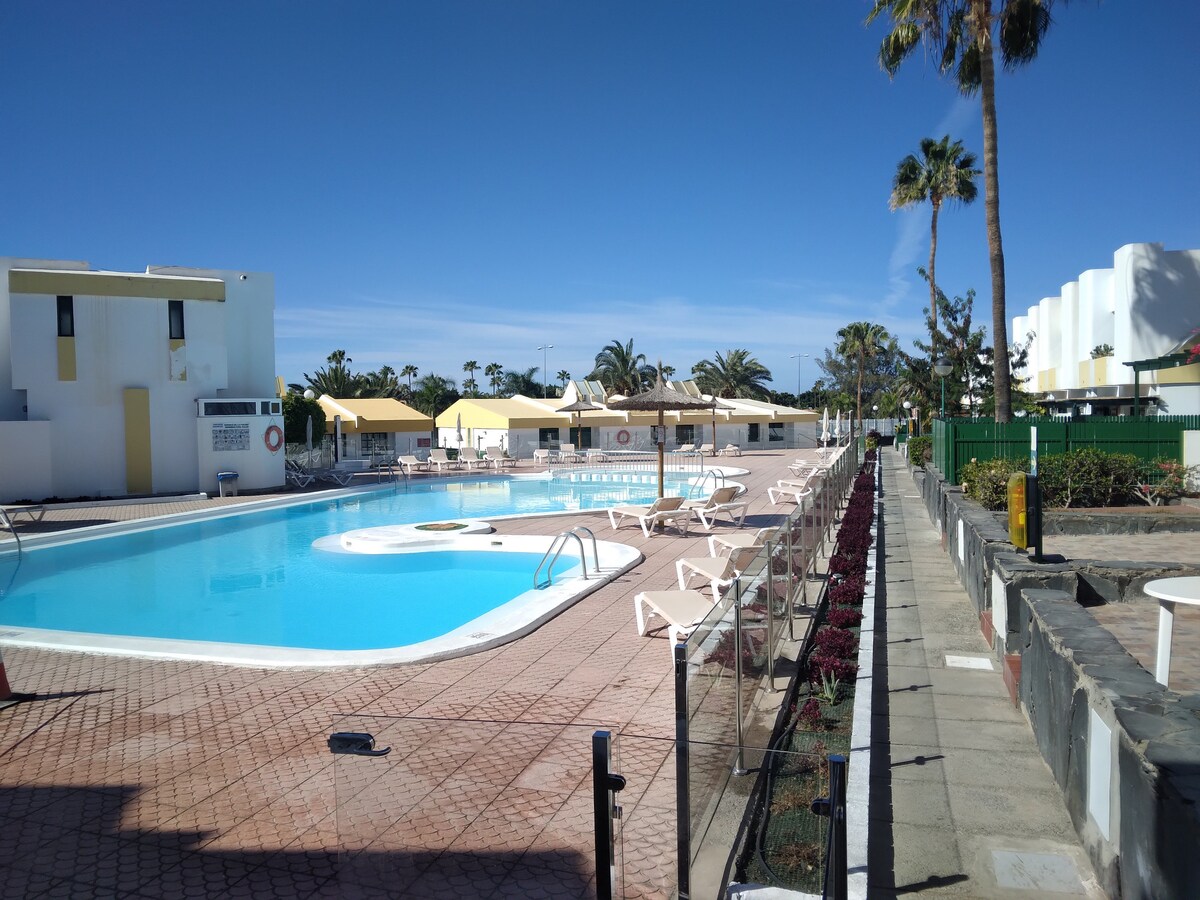 Beautiful, modern completely renovated apartment with one bedroom, one living room with full equipped kitchen and a nice balcony ( pool view). Two quiet Air-conditions Free high speed fiber Wi-Fi & good work place. Washing-machine. 500 meters to the beautiful Maspalomas beach, Across the street, big supermarket & super close to Yumbo center (5 min by foot). A wonderful roof terrace (mountain and seaview) where you can relax and sunbath with or without clothes (The elevator takes you easly up)