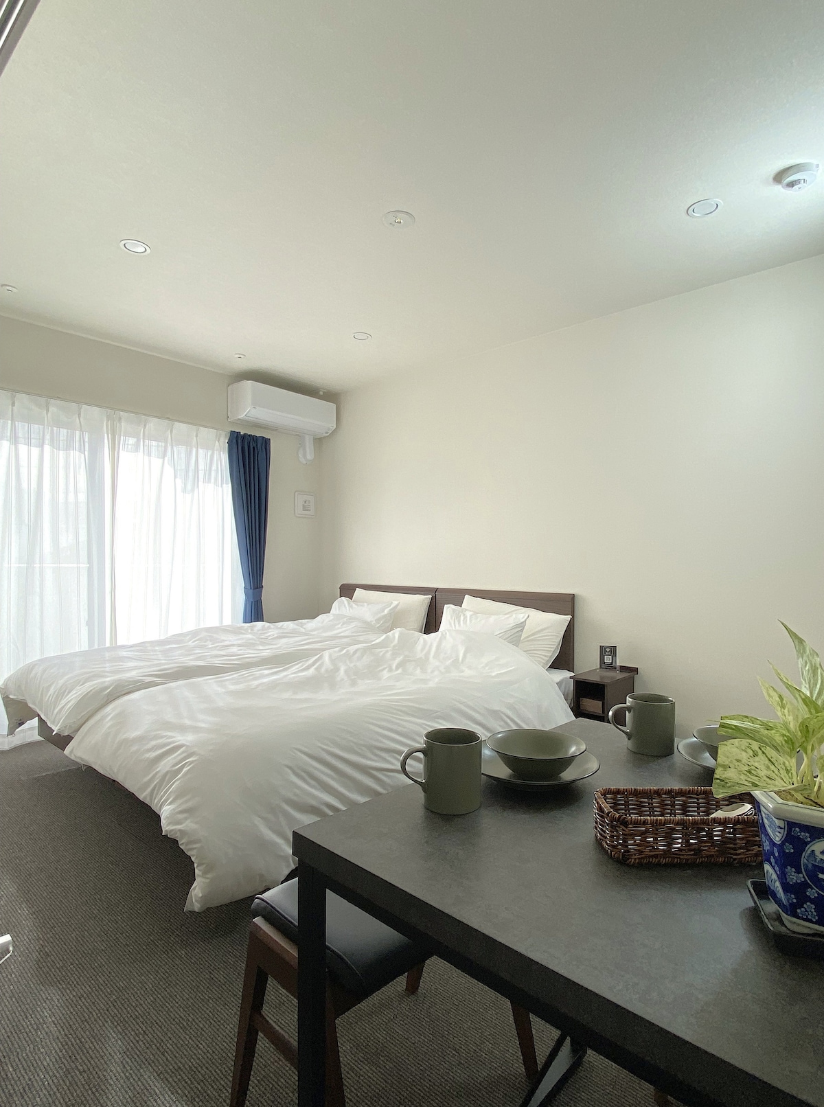 アパートの一室をリノベーションした2LDKの2階のお部屋です。湯畑・バスターミナル・コンビニまで徒歩5分圏内で大変便利な立地で、観光、お仕事、湯治などに最適です。寝室スペースにはダブルサイズのソファーベッド1台、シングルのお布団を1組ご用意していますので、最大3名まで宿泊可能です。 This is a 2LDK room on the second floor of a renovated apartment. The hotel is in a very convenient location, within a 5-minute walk to Yubatake, the bus terminal, and a convenience store, making it ideal for sightseeing, work, and hot spring treatments. The bedroom space has one double sofa bed and one single futons, accommodating up to 3 people.