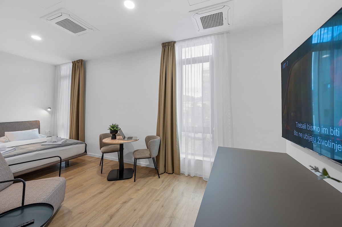 Enjoy a stylish stay in this modern 29 m² suite at Enjoy Suites Zagreb. The room features a comfortable queen-size bed, private bathroom with shower, Smart TV, air conditioning, fast Wi-Fi, mini fridge, coffee machine, kettle, microwave, and toaster. Thoughtfully equipped for both short and longer stays, it offers comfort, functionality, and a convenient city location for business or leisure travellers.
