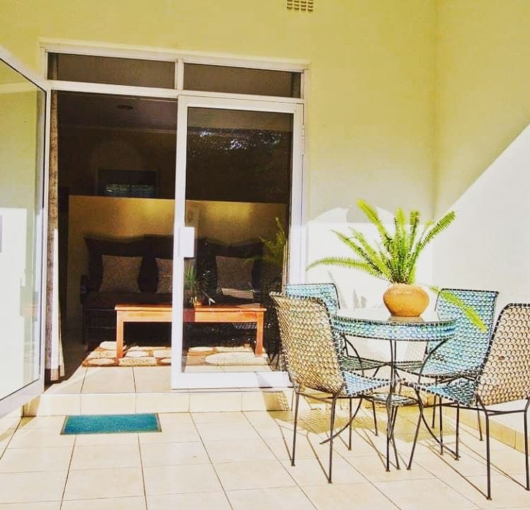 Peaceful, centrally-located. Cosy bed-sitter in yard with main house, queen-size bed, sleeper couch, closet and air-conditioned. Shower, toilet, kitchen space with fridge, microwave, gas-stove. Working table/dining table and a TV with WIFI. Swimming pool and shed with outside chairs available. Beautiful environment with trees and flowers. Cleaning services available. Laundry and ironing services at a cost. Electricity backup available with solar. Wi-Fi available when loadshedding is on.