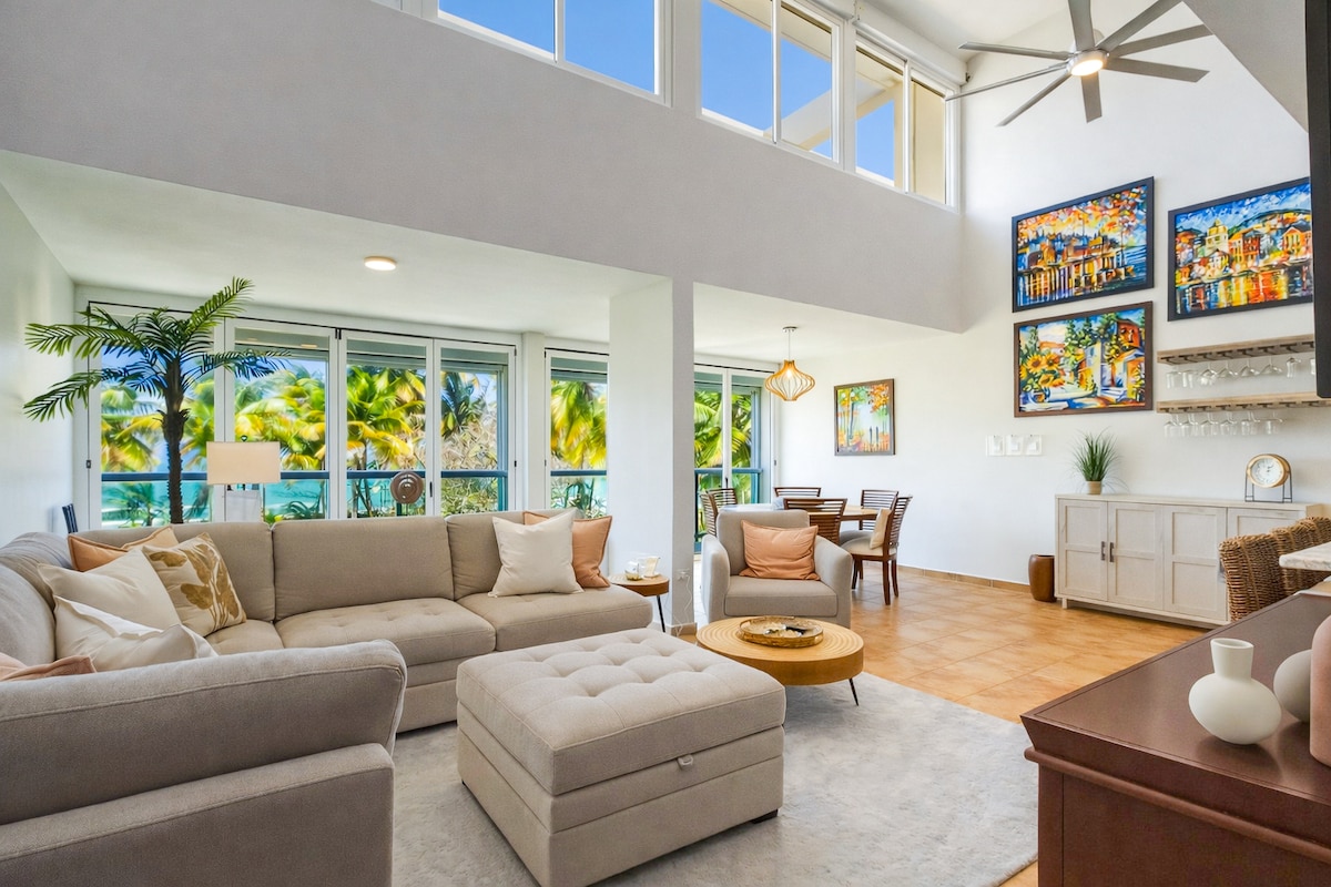 Penthouse de lujo frente al mar en Río Grande con vistas impresionantes al océano y a la selva tropical. Disfrute de una amplia terraza, ideal para tomar el café por la mañana o un cóctel al atardecer. En el interior, los techos de 20 pies de altura y los ventanales que van del suelo al techo inundan el espacio de luz natural. Cuenta con 3 dormitorios: dos con vista al mar y terrazas privadas, y uno con vista a la selva tropical. Los servicios del complejo turístico incluyen piscina, pickleball, tenis, baloncesto, fútbol de playa y seguridad las 24 horas. A solo 40 minutos del Aeropuerto de San Juan.