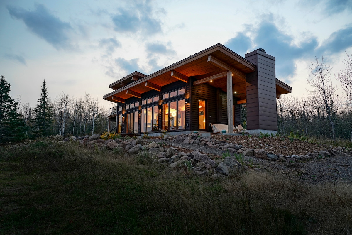 Great for a couple's getaway or family excursion, perfectly located on the North Shore with a spectacular view of Lake Superior. Features stunning timber frame modern design, luxurious master bed and bath, spacious deck, and porch with fireplace. There's nothing else like it on the North Shore. It is perfectly located 20 minutes from Duluth and 5 minutes from Two Harbors, 5 from a boat launch. Our cabin is certified as Net Zero Ready through the DOE and was designed and built by Timberlyne.