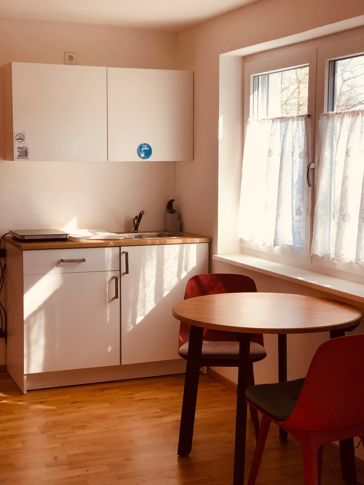 The apartment is on the ground floor of an old farmhouse, newly renovated and modernly equipped. Excellently located, between the Black Forest, Lake Constance and Alb. Ideal for 2 people. Living-bedroom with sitting area and double bed, blackout blinds. Fully equipped kitchen: Senseo coffee machine... Daylight bathroom with rainforest shower. The apartment is self-contained, we live upstairs and use the same entrance. The apartment is pet-free, but our cat lives in the house and garden.