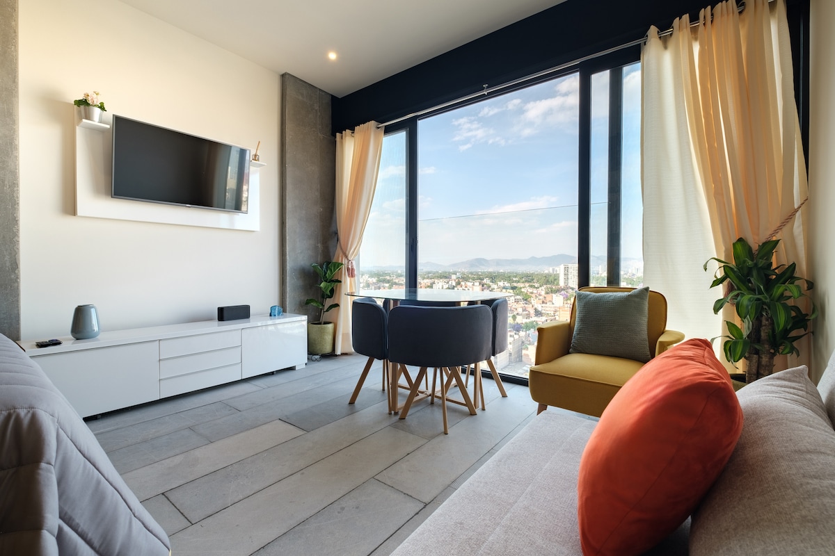 Hermoso y nuevo apartamento muy cerca del centro histórico de Ciudad de México. El apartamento tiene un dormitorio espacioso (cama tamaño king), baño completo, TV inteligente en el dormitorio y en la sala de estar. El sofá de la sala de estar se puede convertir en un sofá cama, de tamaño pequeño, perfecto para un niño. Cuenta con una cocina totalmente equipada con electrodomésticos de alta gama. El edificio ofrece lujosas comodidades: piscina, gimnasio, zona de trabajo, increíbles terrazas para disfrutar de vistas panorámicas de la ciudad.